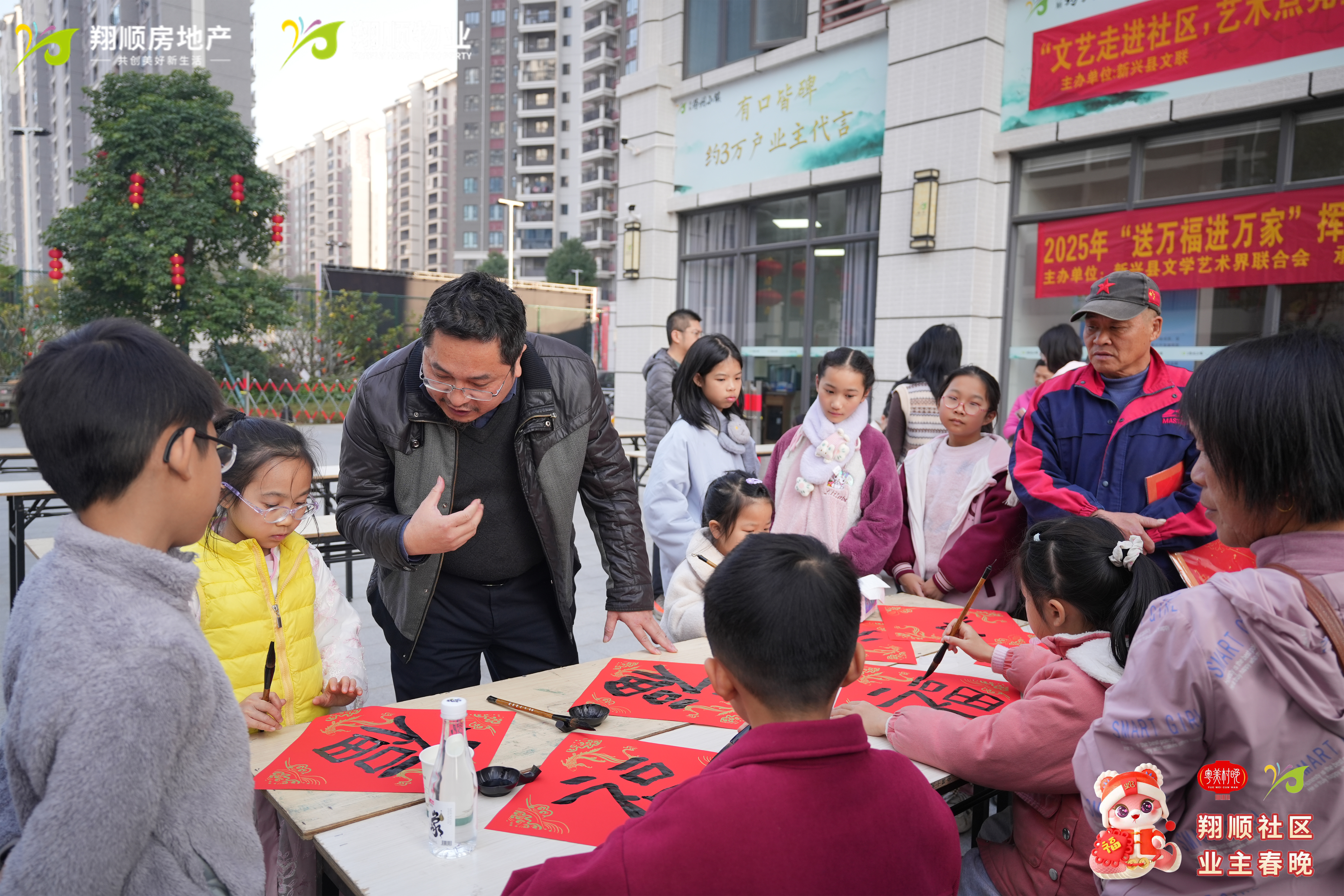 在春晚开始之前,新兴县文学艺术界联合会、新兴县书法家协会、新兴县诗联学会的书法艺术家们携手翔顺在活动现场开展2025年“送万福进万家”活动。书法家们手把手教社区里的孩子写福字,免费为社区居民写挥春、楹联。孩子们在一笔一划中感受着最传统的年味,在书香墨韵中体会传统文化的魅力。